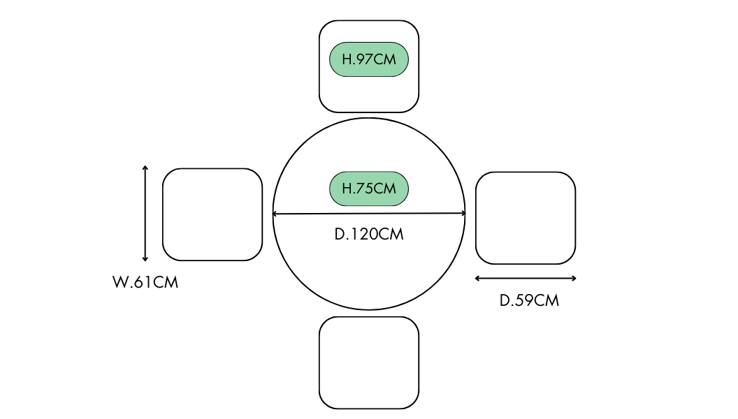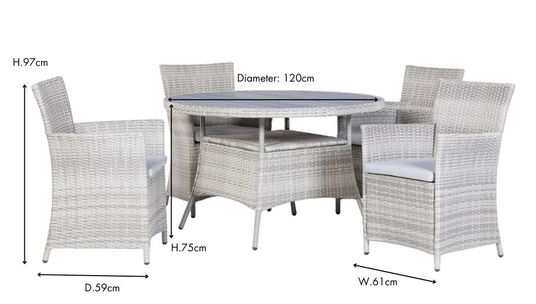 - Dimensions: Chair: L.59 x W.61 x H.97cm. Table: 120cm diameter, 75cm height