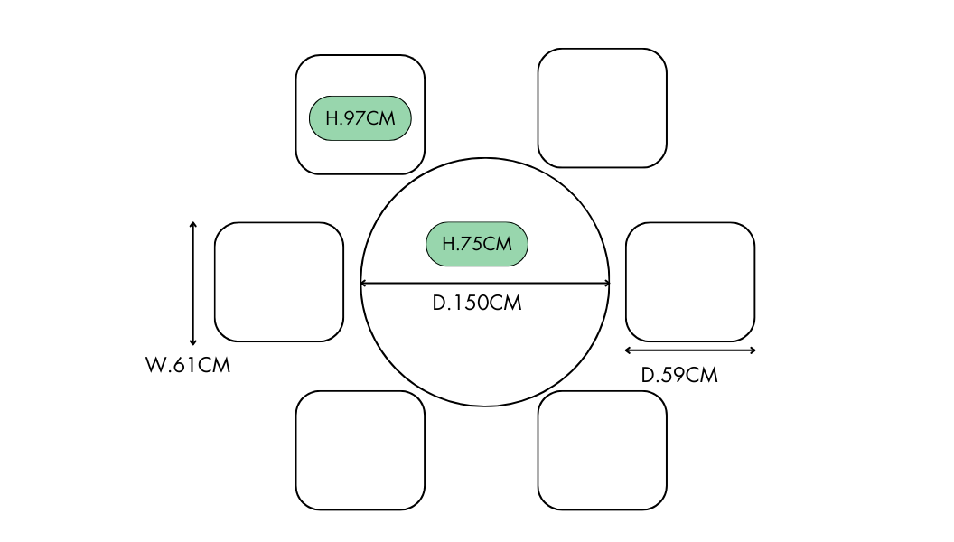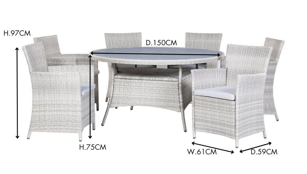 - Dimensions: Chair: L.59 x W.61 x H.97cm. Table: 150cm diameter, 75cm height