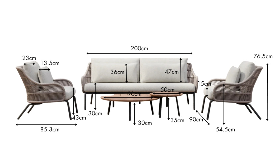 Dimensions: 2-seater sofa: L.200 x D.85.3cm x H.76.5cm | armchair: W.90cm x D.85.3cm x H.76.5cm | large coffee table: D.90m x H.30cm | small coffee table: D.50 x H.30cm