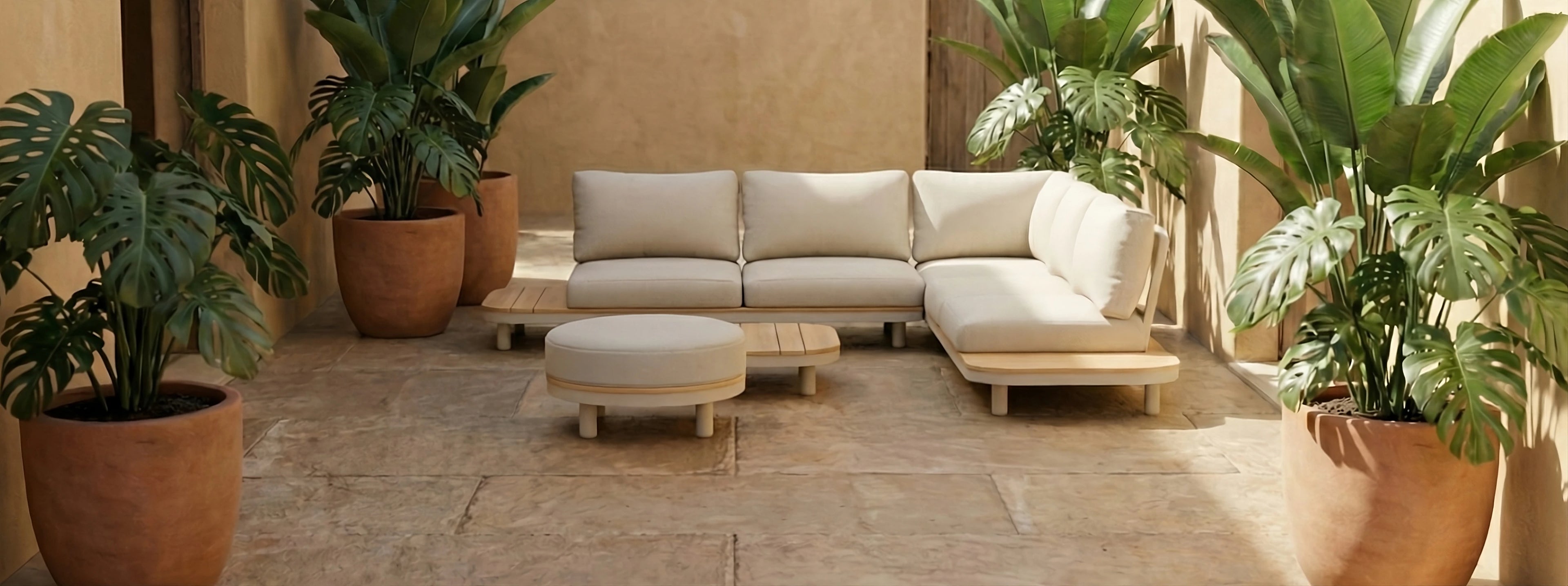 • 6-seater acacia corner sofa featuring olefin seat and back cushions