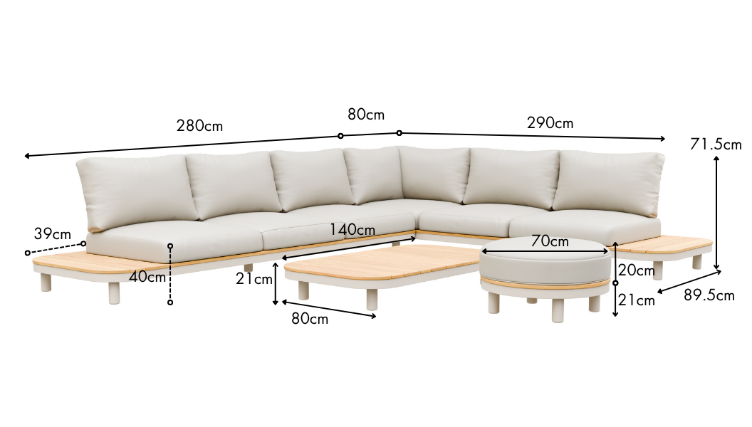 - Dimensions: 3-seater sofa (side table right facing): L.280 x D.90 x H.71.5cm | 3-seater sofa (corner left facing): L.290 x D.89.5cm x H.71.5cm | coffee table: L.140 x W.80cm | ottoman: 70cm diameter