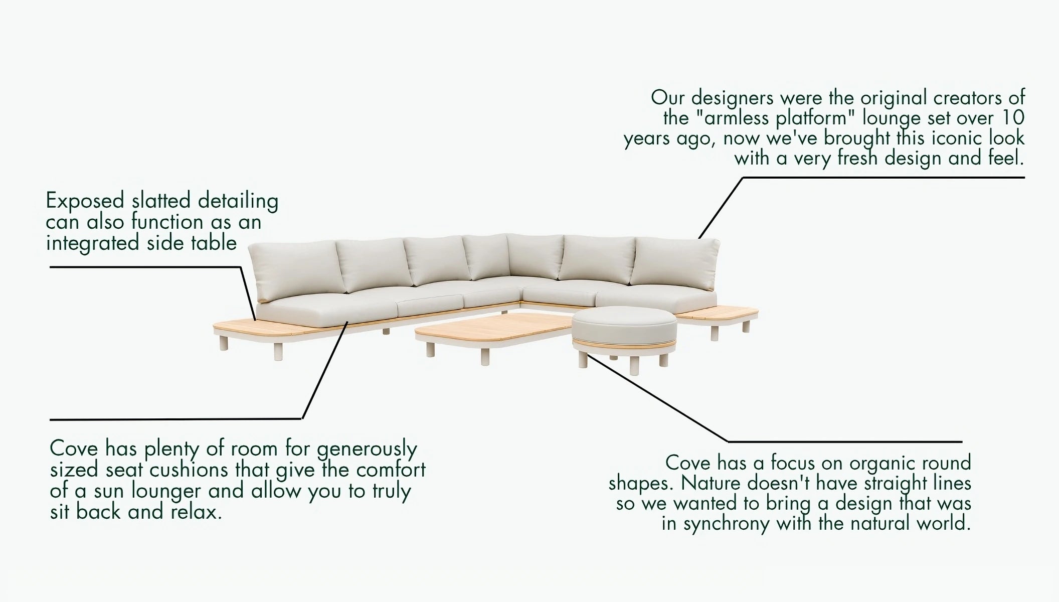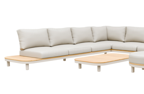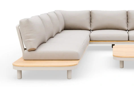 Inspired by luxury resorts, Cove delivers five star quality, comfort and style. This expertly crafted corner sofa combines light-toned eucalyptus wood with thick and bouncy olefin seat and back cushions, so you can create a haven of relaxation.