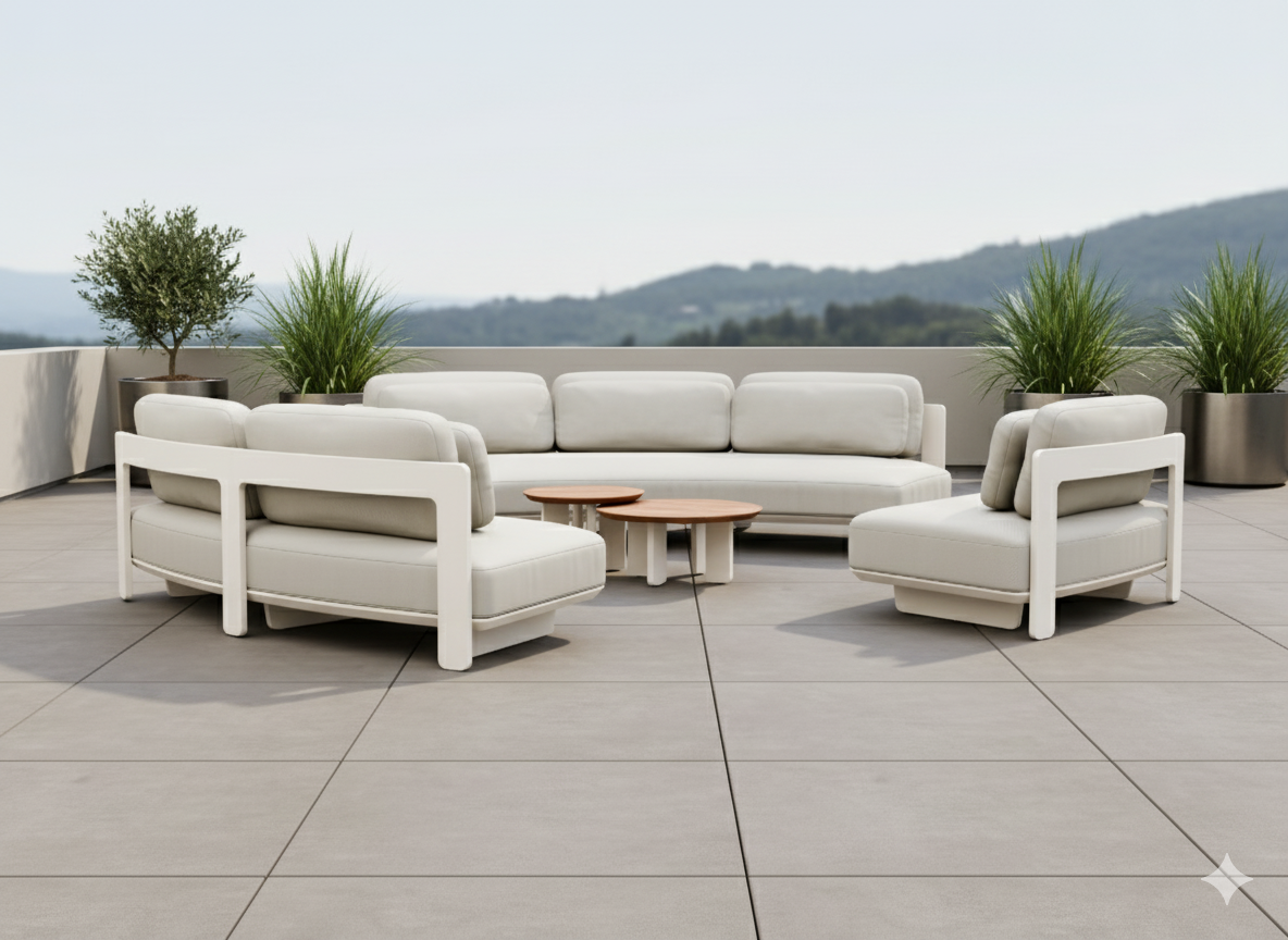- Materials: Aluminium powder coated frame, teak tables, Olefin cushions