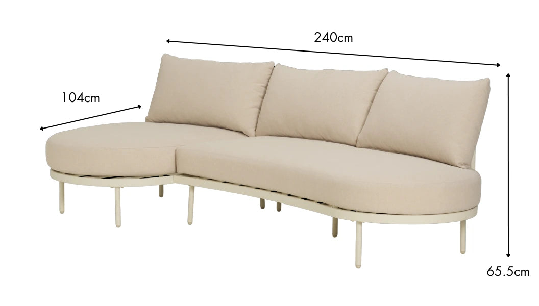 Our Kiki 3-seater chaise sofa adds understated elegance to your outdoor space. Its curved silhouette creates a natural and organic feel that gives you the sophistication of indoor furniture for your outdoor space. Thick and chunky olefin cushions deliver superior comfort, while a slim aluminium frame in a matching ‘sand’ colour gives the Kiki chaise durability you can rely on.