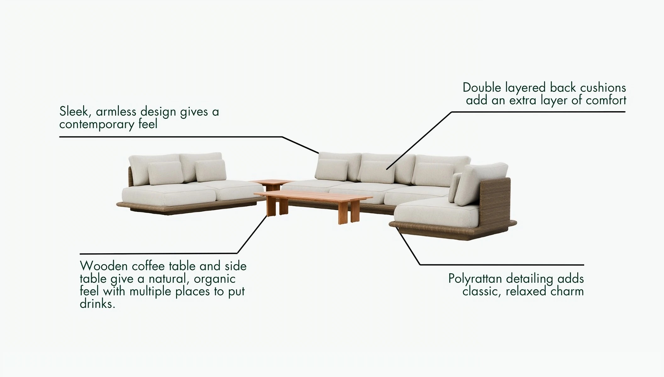 - Materials: Polyrattan woven construction, olefin fabric cushions, wooden coffee table and side table