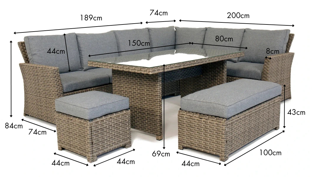 - Dimensions: Left-arm 3-seater sofa: L:189 x D.74 x H.84cm | Right-arm 3-seater corner sofa: L.200 x D.74 x H.84cm | Table: L.150 x W.80 x H.65cm. Square Stool: L.44 x W.44 x H.41cm. Rectangular Stool: L.100 x W.44 x H.41cm.