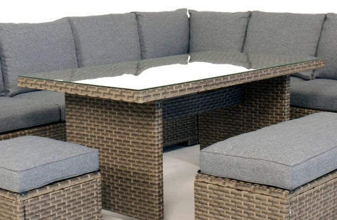 Classic, versatile and timeless- Palma is popular for a reason. We've combined a space-efficient yet luxurious 6-seater corner sofa with a single and double stool, so it's ideal for garden gatherings with family and friends. A tempered glass table top measuring 64cm in height allows you to use Palma for dining, relaxing and everything in-between.