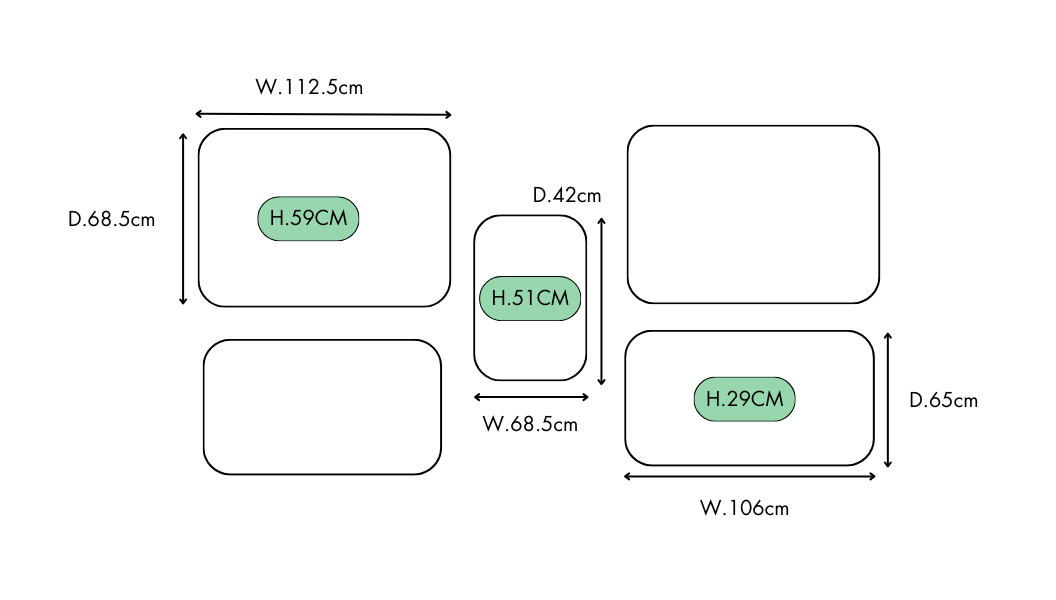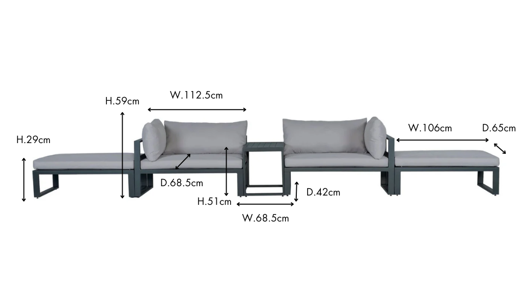 - Dimensions: Sofas: L.112.5 x W.68.5 x H.59cm | Ottomans: L.106 x W.65 x H.29cm |Table: L.68.5 x W.42 x H.51cm