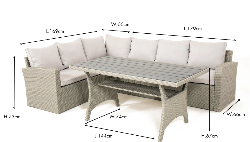 Received my L shape garden sofa and table yesterday and build it today. It is really nice and comfortable but the measurements on the website don't match the actual sofa and it doesn't fit in my patio which is ashame because I measured it beforehand to ensure 169 cm of the short side will fit in and in fact the side is almost 10 cm longer measuring 178 cm. I have tried to contact customer services and the online contact option doesn't work. I kept confirming my order number, my name and postcode and it keep saying that the system cannot find my order. It's just weird. Either way we will use it as two separate sofas for now and hopefully in the future we will extend the patio.