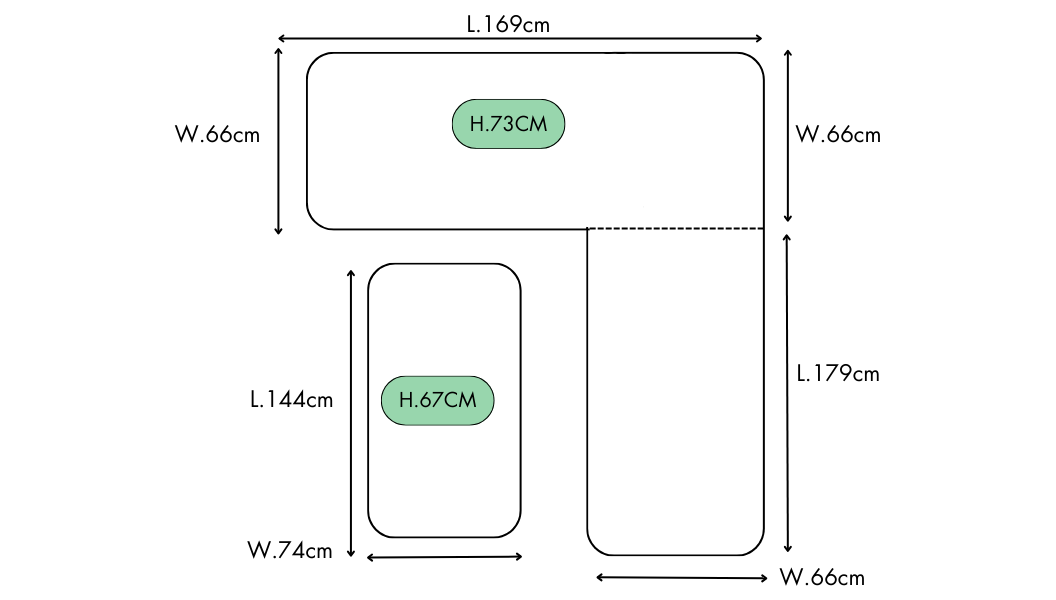 - Dimensions: Corner sofa: two sections measuring L.169 x D.66 x H.73cm and L.179 x D.66 x H.73cm | Table: L.144 x W.74 x H.67cm