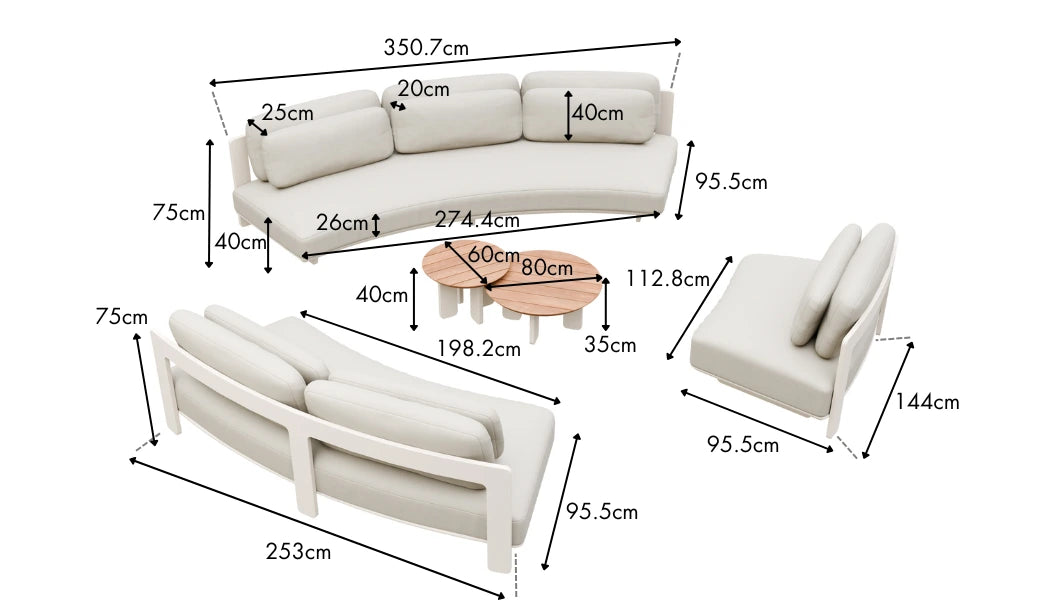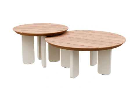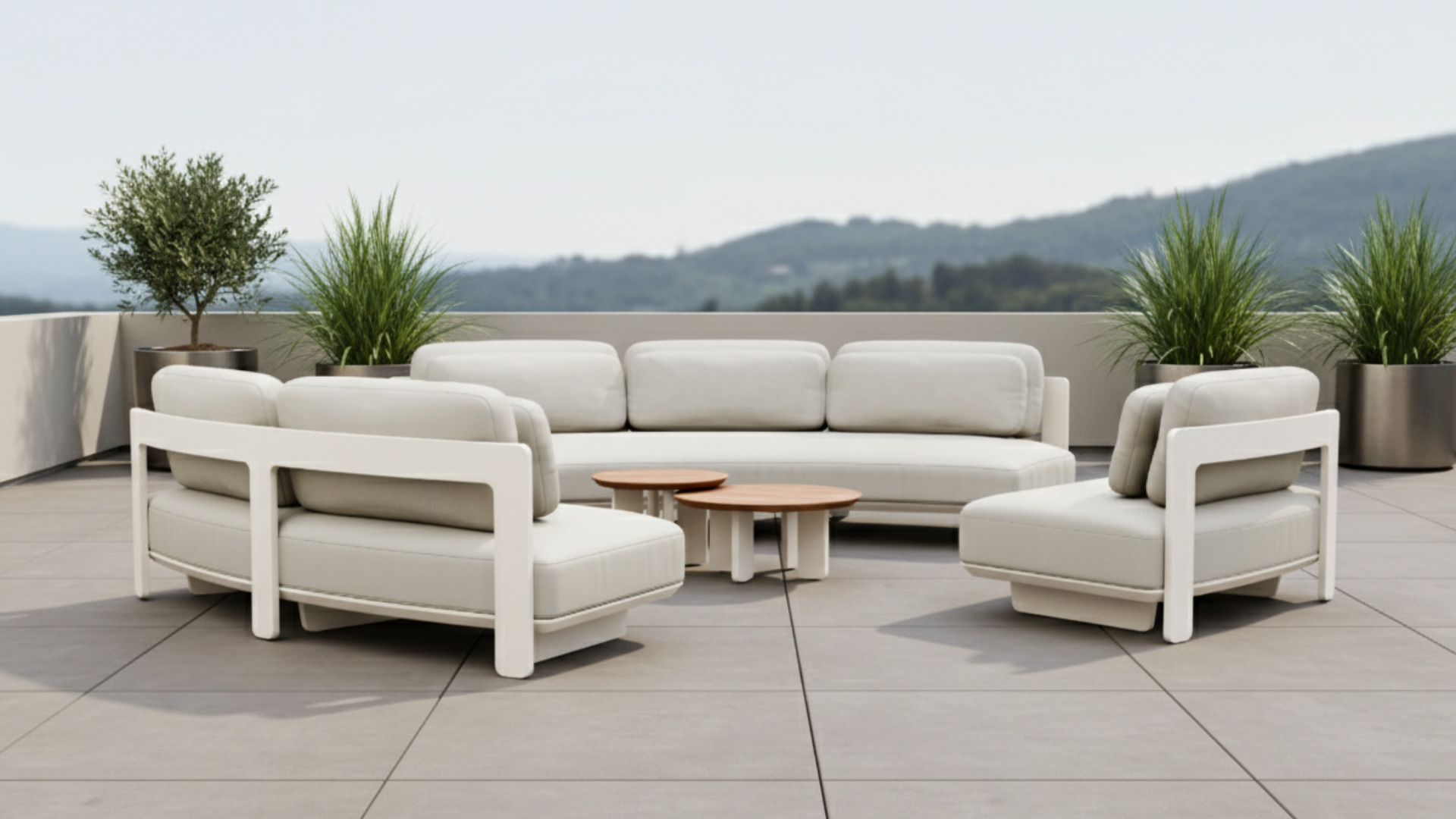 • Materials: Aluminium powder coated frame, teak tables, Olefin cushions